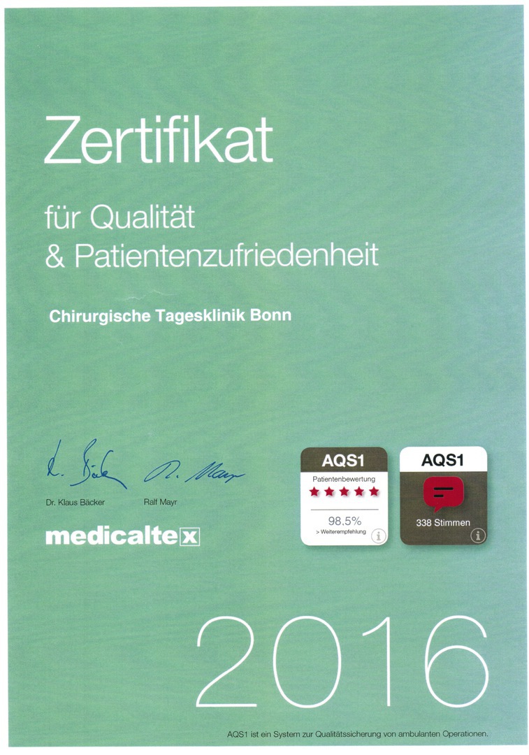 AQS1 ist ein wissenschaftlich anerkanntes System zur Qualitätssicherung bei ambulanten Operationen. Der gesamte Behandlungsablauf der Operation wird mittels eines Fragebogens anonymisiert erfasst und wissenschaftlich ausgewertet um die Qualitätsmaßnahmen zu dokumentieren. Selbstverständlich unterliegt die Datenerhebung den gesetzlichen Datenschutzregelungen.